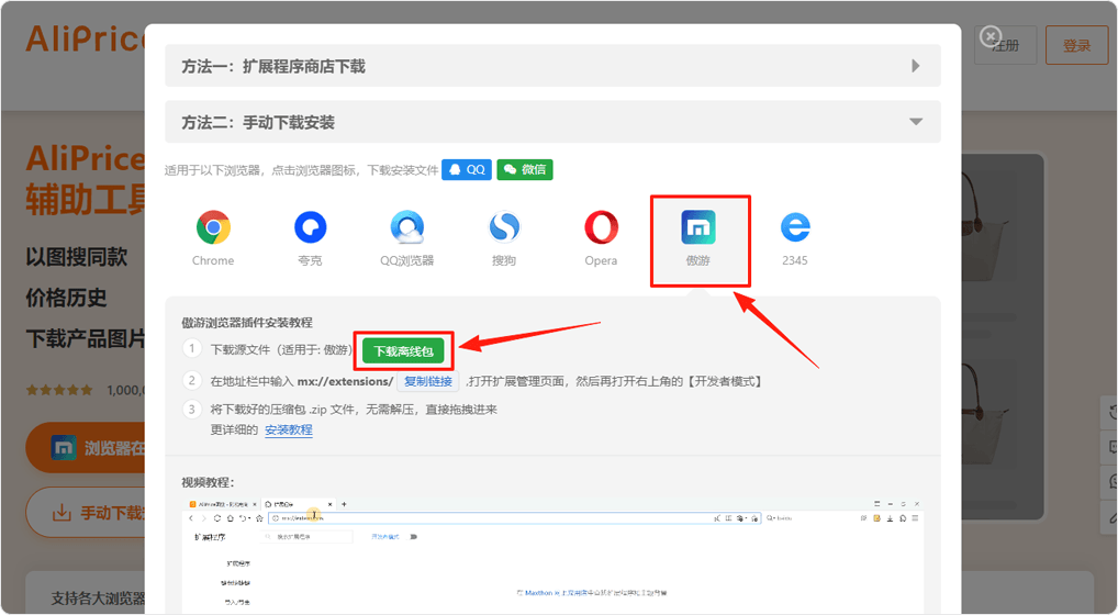 In this pop-up, click the Maxthon browser icon, then click [Download Offline Package] to save the extension ZIP file to your computer. Or, click here download offline package directly.