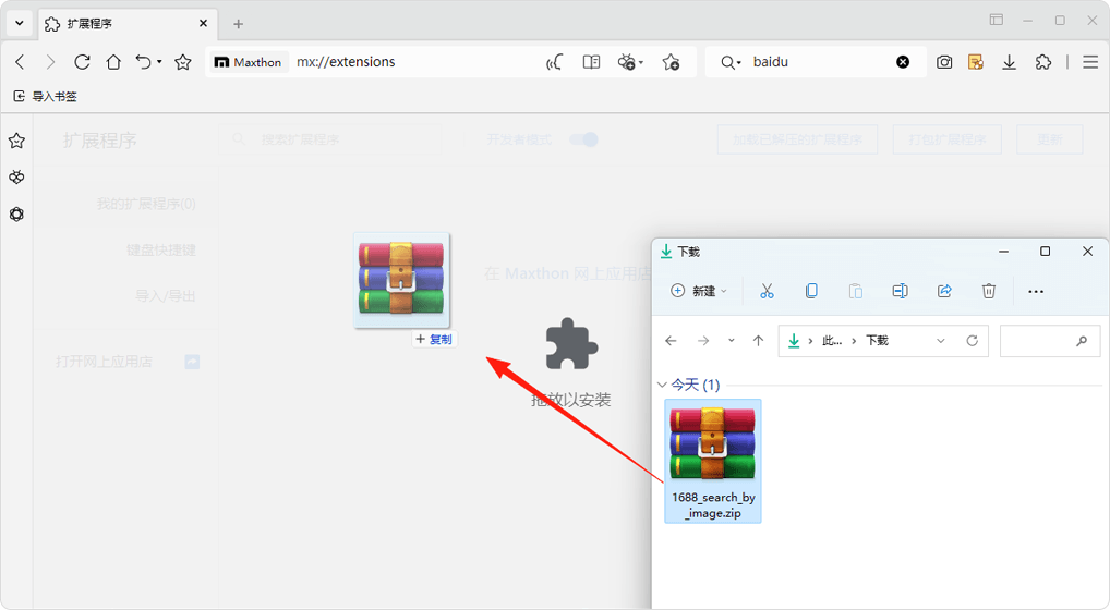 Once Developer mode is enabled, drag and drop the downloaded ZIP file (do not extract it) directly into the page. After installation, you can delete the original ZIP file; it will not affect the extension.
