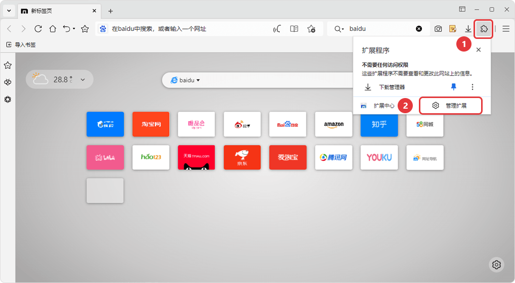 In the browser's top-right corner, click "" icon [Manage Extensions]