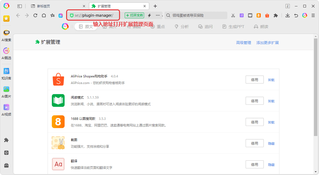 Method 2: Enter se://plugin-manager/ Copy Link in the address bar to open the extensions management page.
