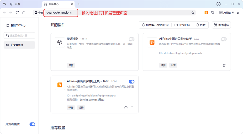 Method 2: Enter quark://extensions Copy Link in the address bar to open the extensions management page.
