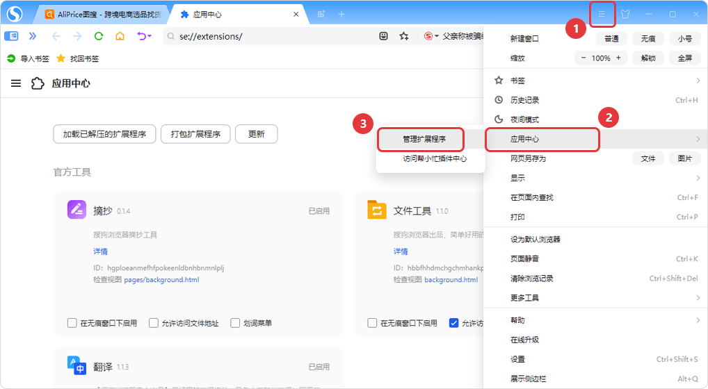 In the browser's top-right corner, click "" icon [Application Center] [Manage Extensions]