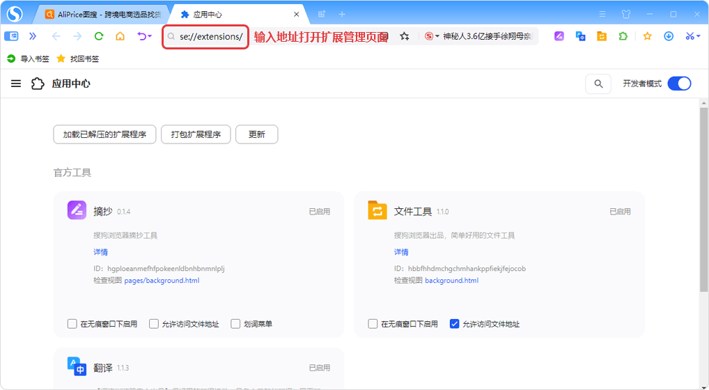 Method 2: Enter se://extensions Copy Link in the address bar to open the extensions management page.